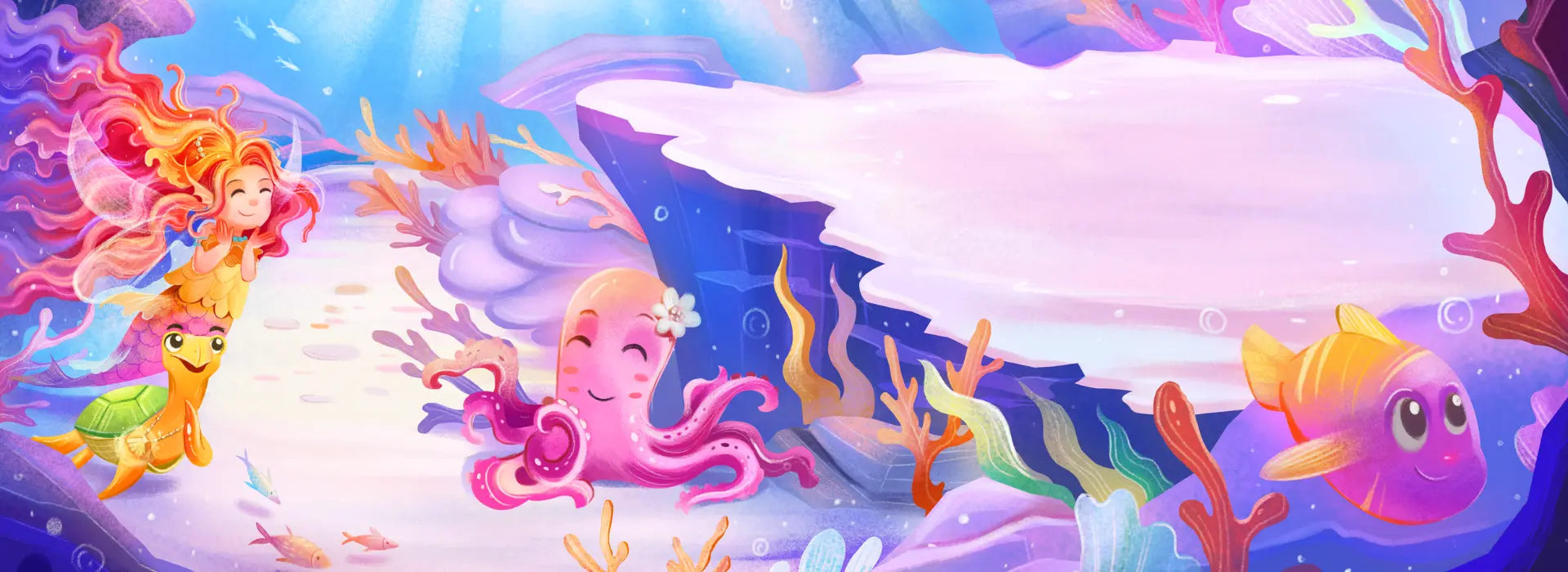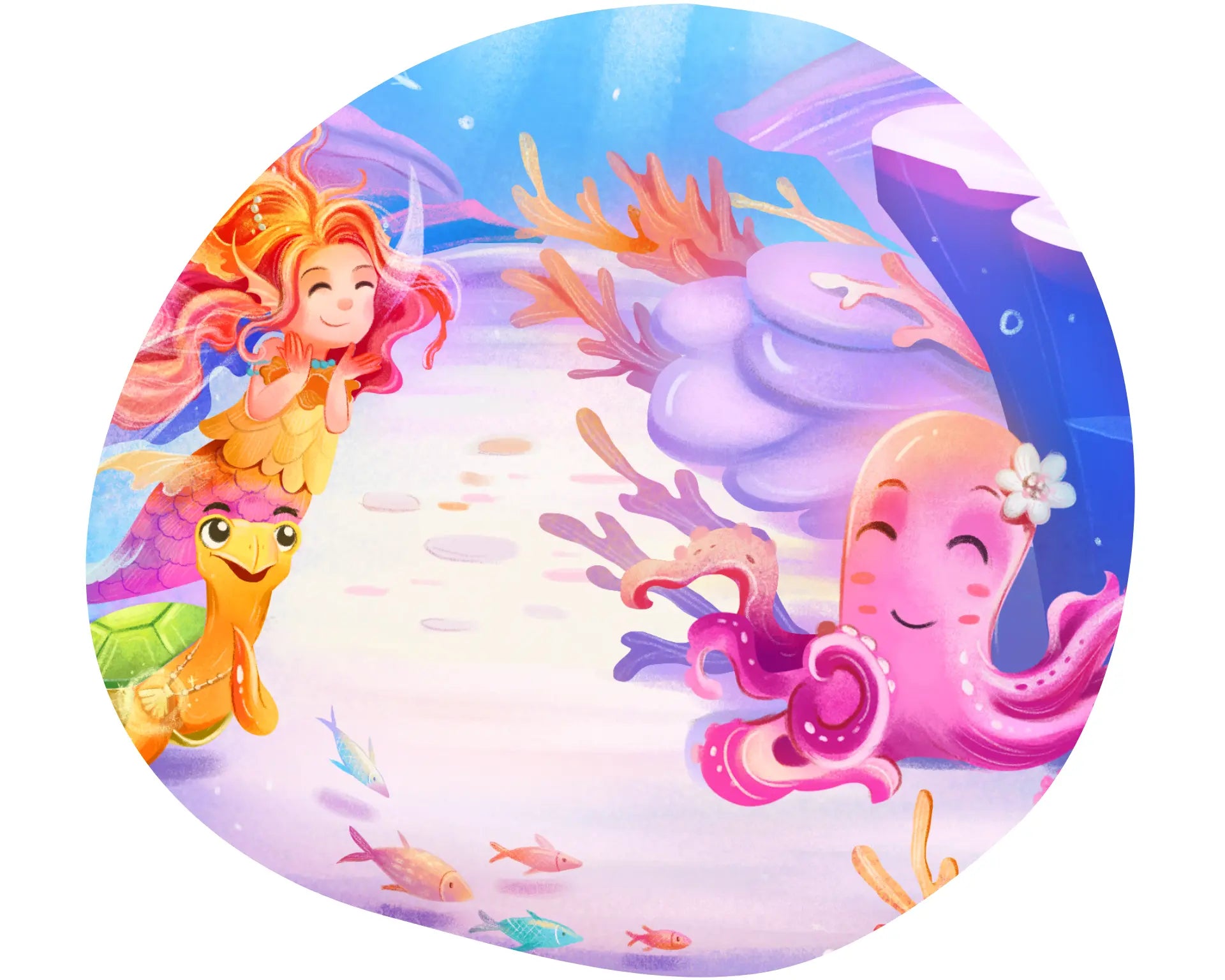 Inky is a friendly and clever pink octopus. While playing hide-and-seek, Inky got tangled in the kelp forest. She released trails of ink to hide from dangers while patiently waiting for brave adventurers.