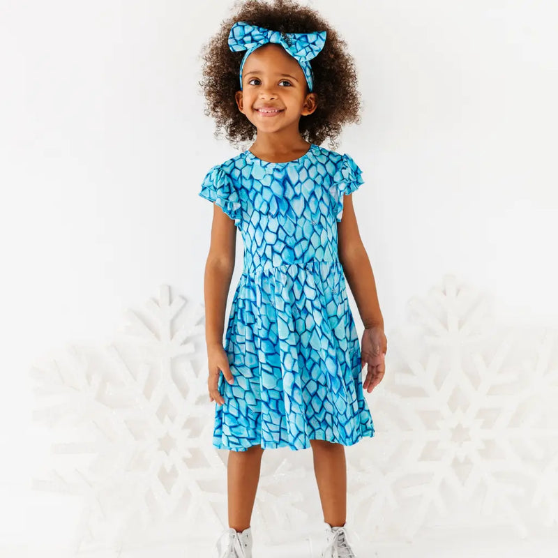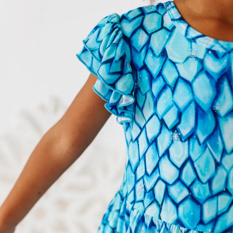 Brave the frost for bedtime adventures with this flutter twirl dress inspired by Frost the Dragon, featuring icy blue scales and scattered delicate snowflakes. Made from silky soft bamboo, it features a lined bodice, full skirt, and even side pockets. Perfect for toddlers and kids ready to dance and snuggle up and soar through winter skies and drift off beneath frosted dreams!