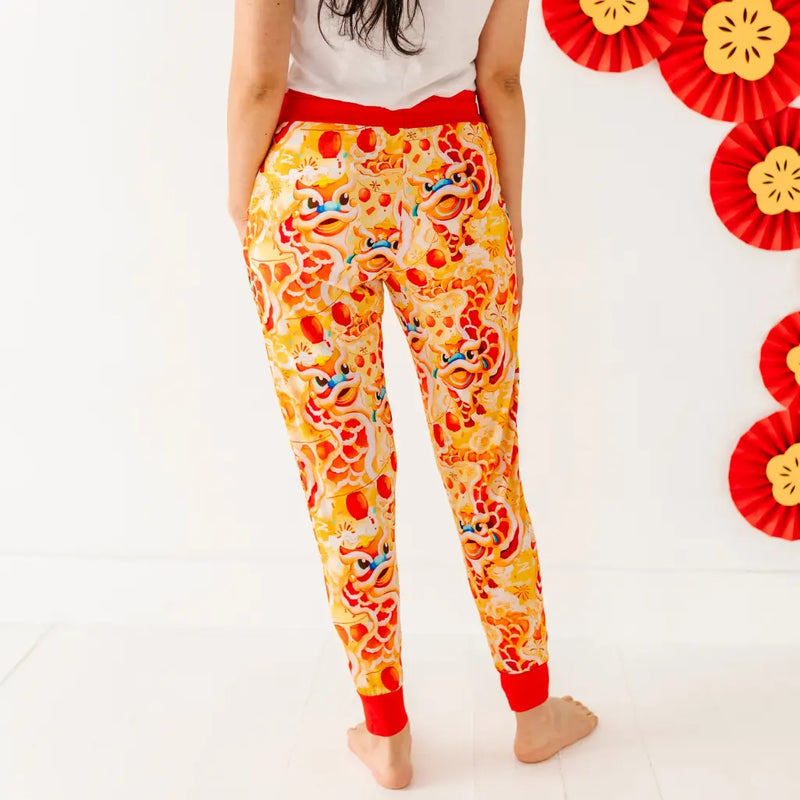 Match your little ones as they celebrate lunar new year with this women's pajama pants inspired by Lion Dancers, featuring vibrant red and golden festival lion dancers surrounded by glowing lanterns and bursts of celebration. Create magical matching moments with your littles as they welcome luck, laughter, and bright new beginnings into their dreams!