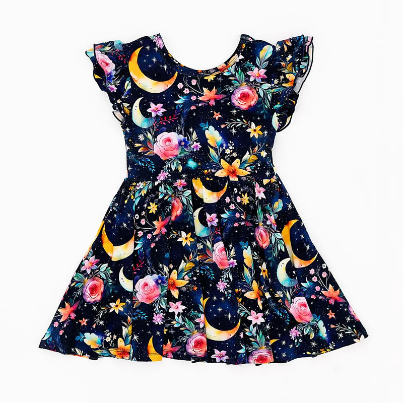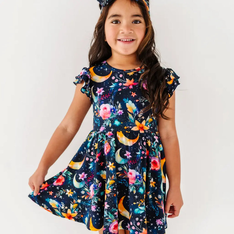 Be the adventure with this flutter twirl dress inspired by The Magical Forest, featuring mesmerizing pattern of shimmering leaves and glowing flowers in vibrant, jewel-like colors. Made from silky soft bamboo, it features a lined bodice, full skirt, and even side pockets. Perfect for toddlers and kids ready to dance and snuggle up and drift into dreamy adventures!