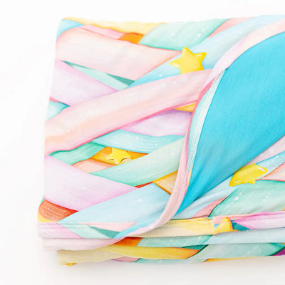 Immerse into magical bedtime quests with this blanket inspired by Max the Mummy, featuring a playful pattern of pastel rainbow wraps intertwined with twinkling golden stars. It’s thoughtfully designed with a double-layered weave and smooth rounded edges. Perfect for toddlers and kids ready to wander through enchanted portals and mystical lands, all cozily bundled in bedtime wraps!