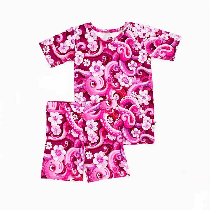 Curl into underwater dreams with this short pajama set inspired by Inky the Octopus, featuring a playful pattern of swirling pink tentacles and delicate white flowers. Made from silky soft bamboo, it is perfect for toddlers and kids ready to explore vibrant coral reefs and mysterious underwater worlds with friendly octopuses!