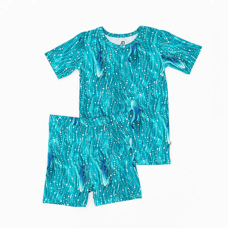 Glide into underwater dreams with this short pajama set inspired by Kai the Whale Shark, featuring majestic whale sharks and shimmering teal waves. Made from silky soft bamboo, it is perfect for toddlers and kids ready to explore vibrant coral reefs and mysterious underwater worlds with these gentle giants of the sea!